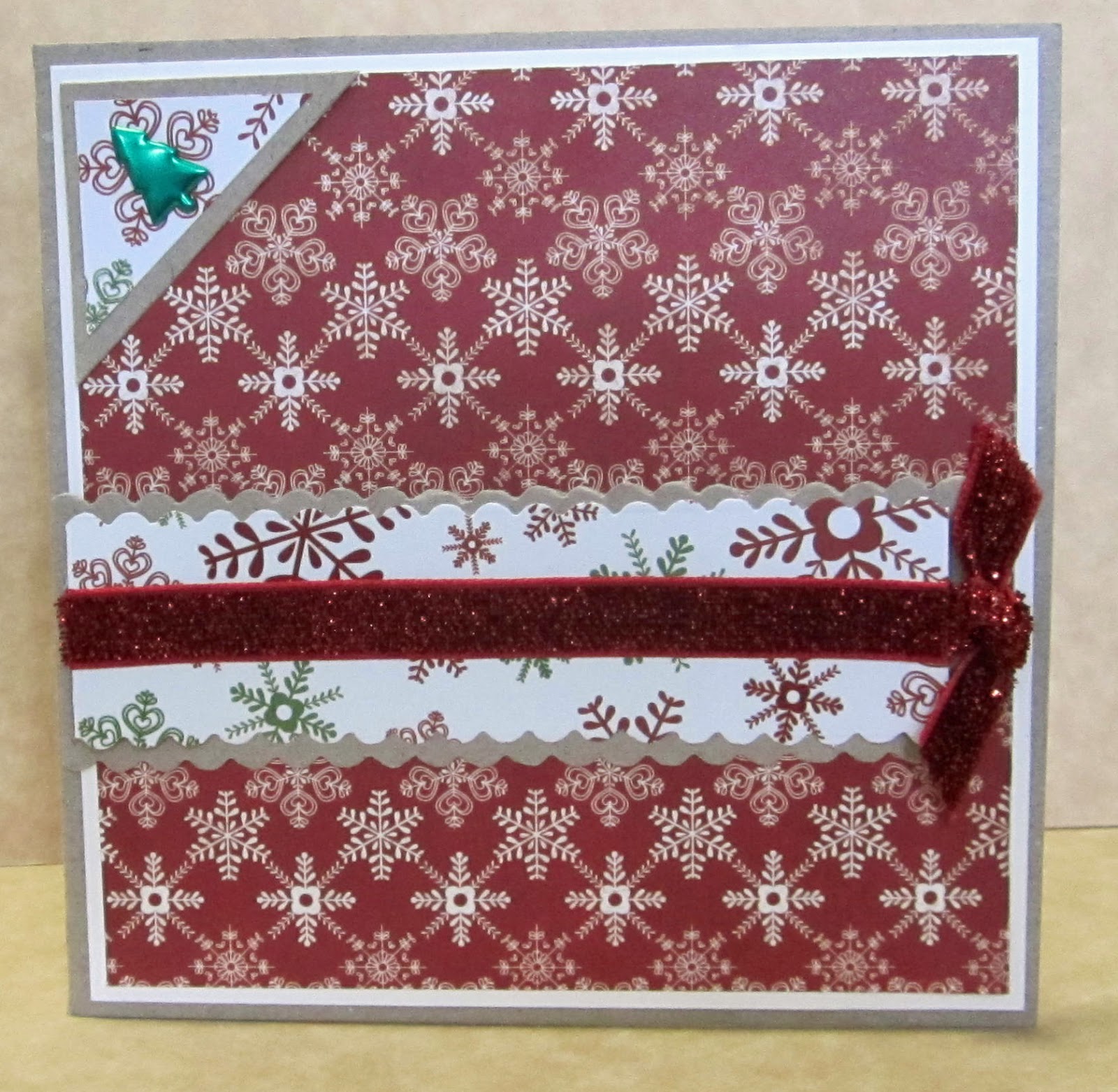 Time is short for making Christmas cards but this example shouldn't take you too long. The singlefold red card is available from Regal. Tania has backed some decorative paper from their specialty paper room with gold card and then added corder stickers. She has used the same gold underneath the red "Merry Christmas" ribbon which doubles as the greeting. (If you are in a huge hurry you could make a similar card without the gold backing).